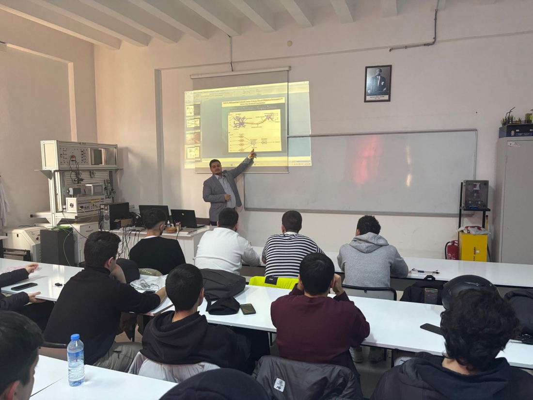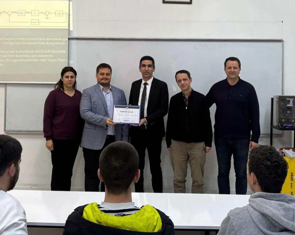 “Matlab–Simulink Tabanlı Yapay Zekâya Dayalı Değişken Referanslı DC Motor Hız Kontrol Uygulaması” başlıklı seminerde, yapay zekâ temelli kontrol yöntemlerinin DC motor hız kontrolünde kullanımı ele alındı. Matlab–Simulink ortamında gerçekleştirilen modelleme ve uygulama örnekleri üzerinden, öğrencilere hem teorik hem de uygulamaya yönelik güncel bilgiler aktarıldı.
